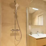 A fürdőszoba felszerelései magába foglalják a zuhanykabint és külön WC-t.